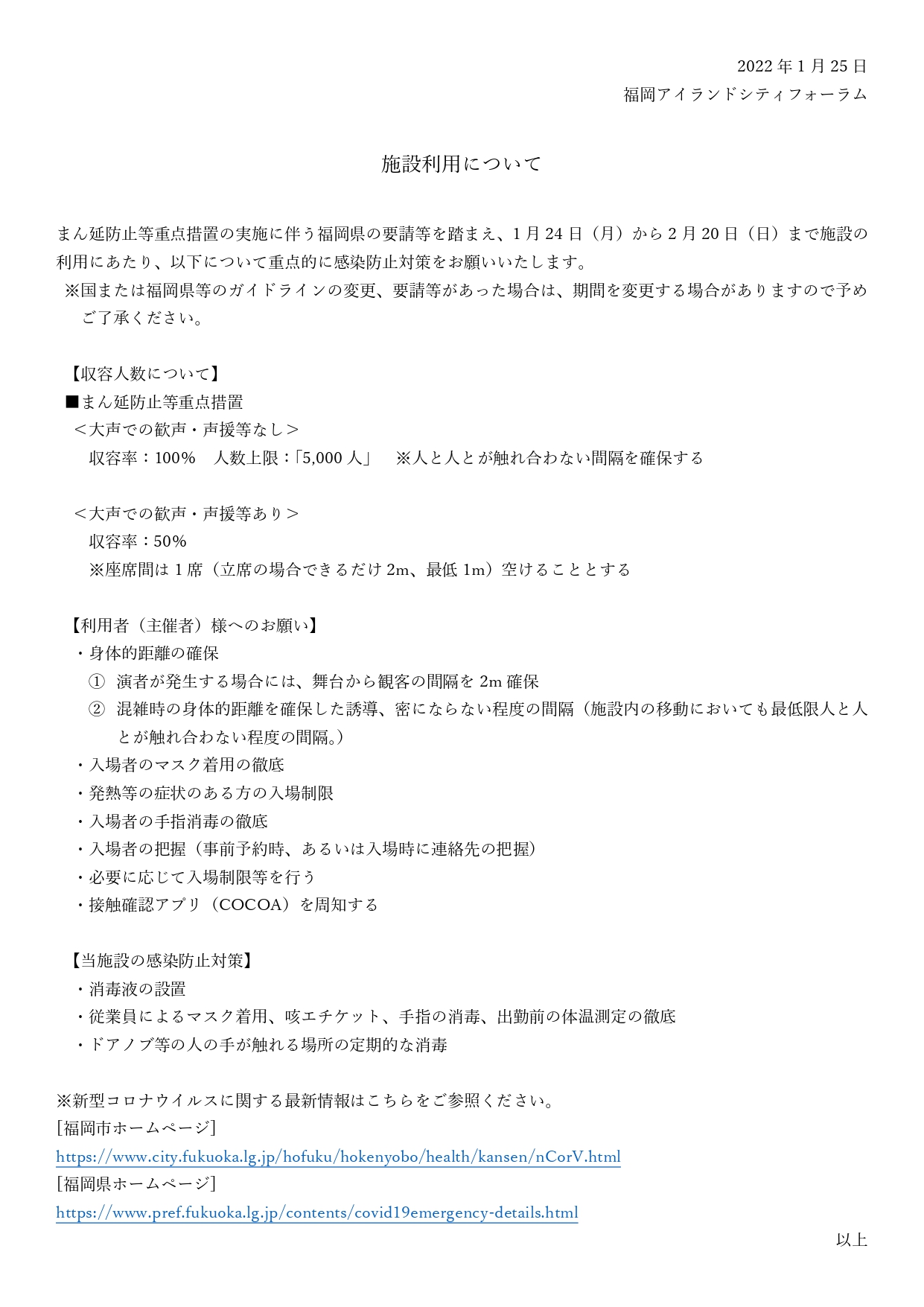 NEWS 新着情報 TOP 新着情報 施設利用について 2022.01.25 お知らせ 施設利用について まん延防止等重点措置の実施に伴う福岡県の要請等を踏まえ、1月24日(月)から2月20日(日)まで施設の利用にあたり、添付ファイルの通り変更いたします。 施設利用について